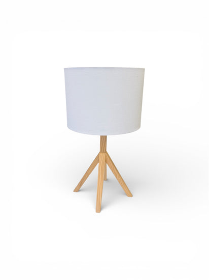 Modern table lamp featuring natural wooden tripod base with white fabric drum shade. Scandinavian-inspired design adds warm, minimalist elegance to any room. Perfect bedside or desk lighting.